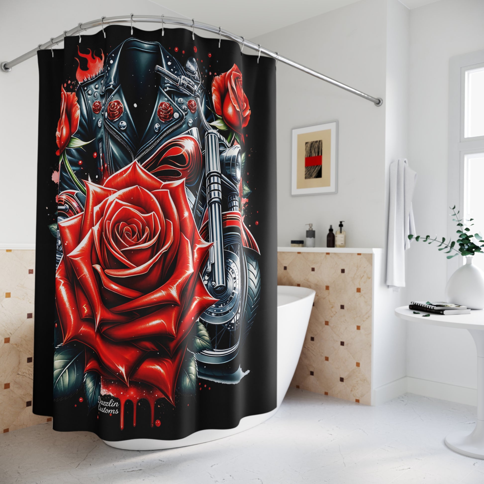 Transform your bathroom into a bold sanctuary with this striking shower curtain. Featuring an eye-catching design of roses and a motorcycle, this curtain exudes a rugged yet romantic vibe that can elevate any bathroom decor. Perfect for those who embrace a unique style, it resonates with motorcycle enthusiasts and anyone who appreciates artful decor. Whether it's for a housewarming gift, a birthday celebration, or a festive addition for holidays like Valentine's Day, this shower curtain adds character and flair to everyday routines. It harmoniously fits into modern, eclectic, or vintage-inspired spaces, making your bathroom a personal oasis.